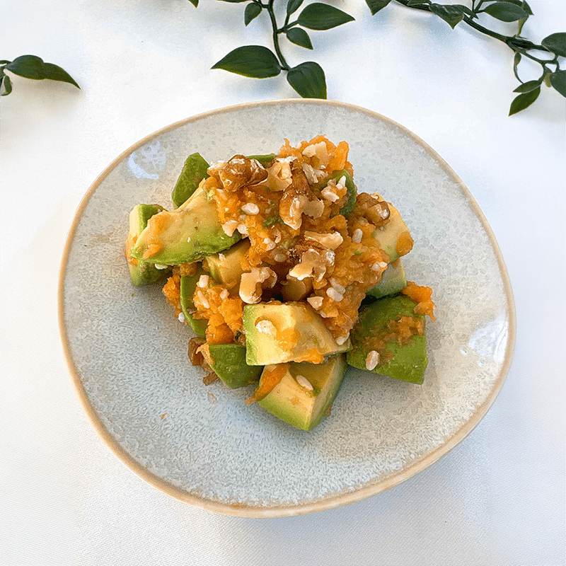 アボカドのビタミンEと人参のビタミンAレモン汁のビタミンCが合わさって、美腸も美肌も叶えてくれる一品です。アボカドのまろやかな味わいと、くるみのザクザク食感とのコントラストもお楽しみください☆