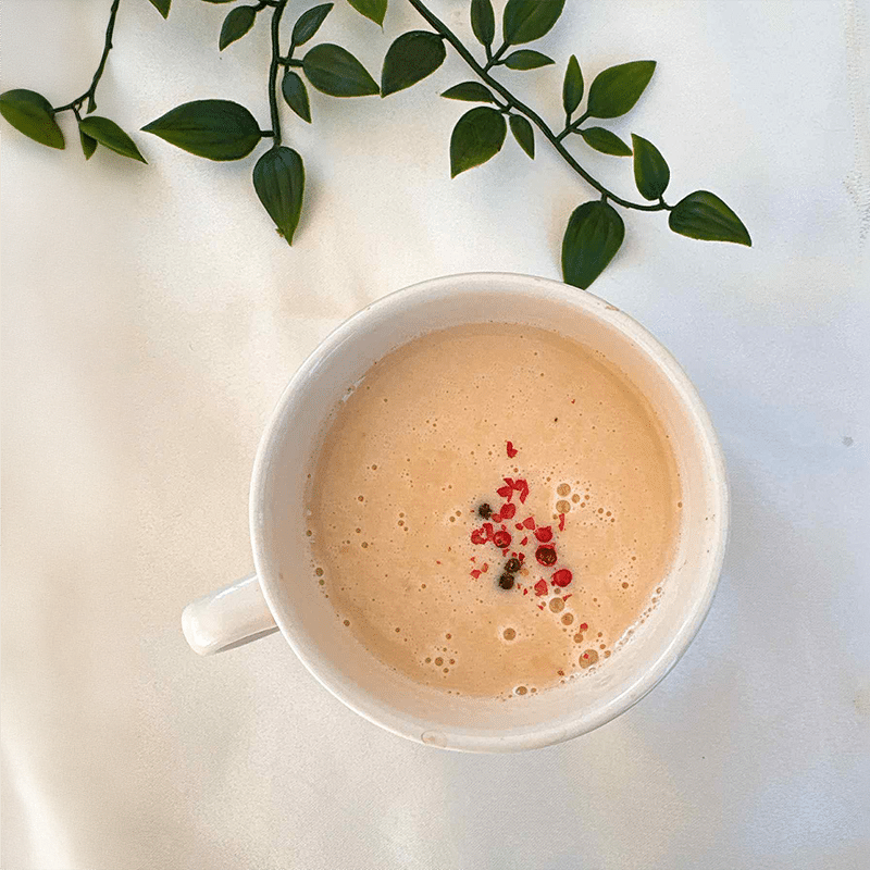 3. 器に注ぎいれ、ピンクペッパーを振る。